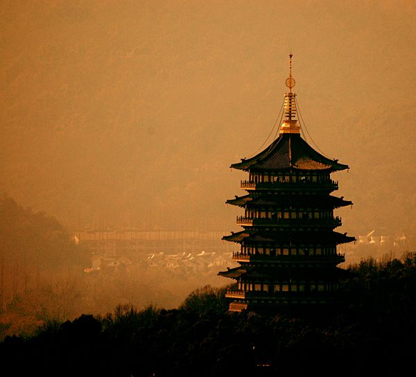 夕阳笼罩下的雷峰塔。塔的街对面是著名十景之一的南屏晚钟,也就是净慈寺,挺大一个寺院。