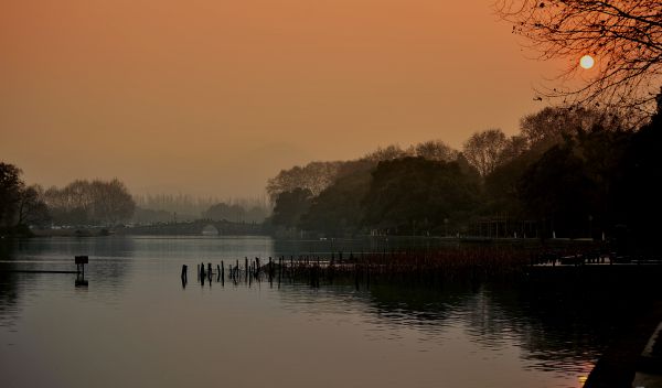 北山路上看西湖落日。