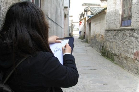 在阳光照耀的楼台上早餐。看见屋墙外的水渠边一块农家小院里的田地。水渠转角的角落是写生的孩子。用笔描着眼前的色彩,极其专注。