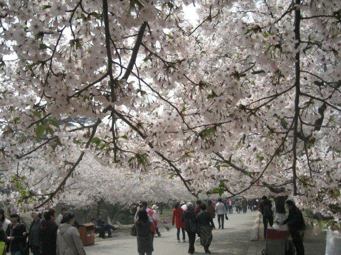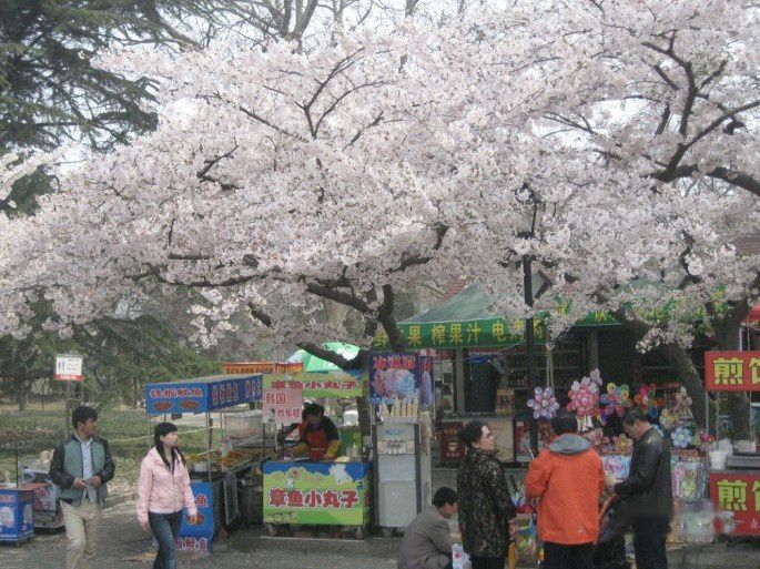 喜欢站在樱花树下仰望天空,因为看到的,除了蓝天就是一层层的樱花,纯净而美丽。站了很久很久,流连忘返。羡慕这个吃货摊点,整天与樱花为伍。