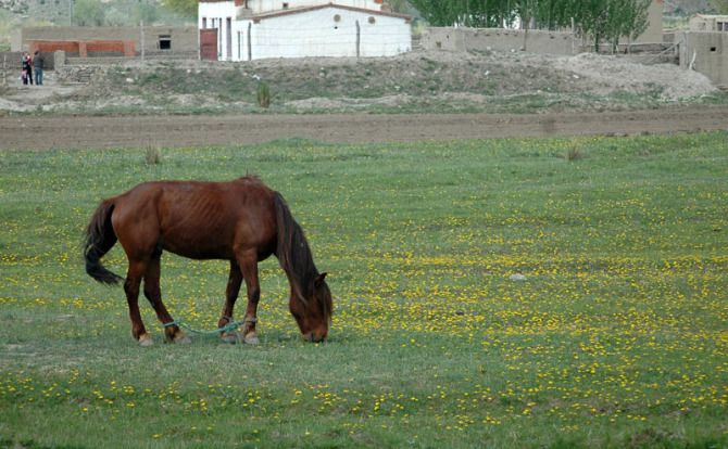 路上又看见一匹马在一片小黄花里吃草,我们赶紧下来,我头戴一朵小黄花,非常骚包地让小鸟拍照。小鸟去追赶那匹马,要和它合影,结果那匹马虽然被绑了三条腿,还是比小鸟跑得快,小鸟很郁闷。师傅说,是因为马不吃回头草,所以容易跑丢,所以要把腿绑起来。