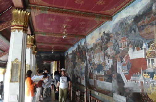 围绕整个玉佛寺的走廊上共有178幅图画与韵文,是拉玛一世时所绘,讲述一个神话故事。绿色的怪兽是坏的,喜欢抢别人的老婆,白色的猴子是好的,具有神力,帮助国王救回皇后,有一次甚至施展神力将整个城市包起来,免于坏人的入侵,绘画的手法相当活泼立体。