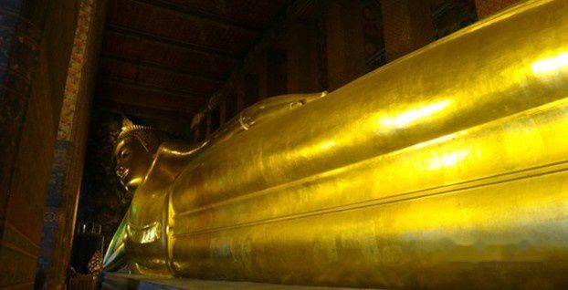 卧佛寺内卧佛为世界最大卧佛,长46米,高15米,每只脚的脚底便长达5米,上刻有108个佛像图案。佛卧之姿态,在表达佛陀追求涅磐时之姿态。其右手托头,全身侧卧,悠然于佛坛之上,殿堂四壁以描写佛祖生平的巨型壁画相伴。卧佛寺之中,佛塔林立,大小佛塔加起来近百之多。这些佛塔或贴满金箔,或镶满彩瓷,4座大塔尤为壮观。而书写在卧佛寺内走廊柱上、壁上及牌厅上的有关寺庙历史、佛史、药方、文学等方面的石碑,则形成了卧佛寺内的另一独有景观,诸多在民间已经难以寻到的知识在这里却可以寻得到。也因此,卧佛寺有了“泰国第一所大学”之名。