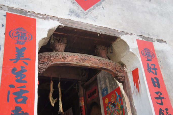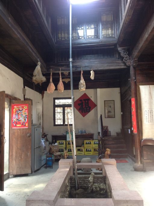 这里民居大多是天井房,据说一些面积较大的民房都是地主家留下的。门檐上都有砖雕,雕刻的人物栩栩如生,大门下门槛或是木制的,或是大石块制的,长久的磨炼,这些也大都变得光滑发亮了。门槛上还立上一个内门槛,简单的雕琢也维妙维肖,可见古人的木工技艺高深。我不得不为古建筑的精工巧作所兴奋。房中间是个天井,上方是个敞开天井,雨时,大雨由此落入天井,晴时,阳光由此射入厢房。天井呈长方形的,四周是个50公分左右的深梁,与外界相通,落入天井的水也就会流到外面去。太神奇了。