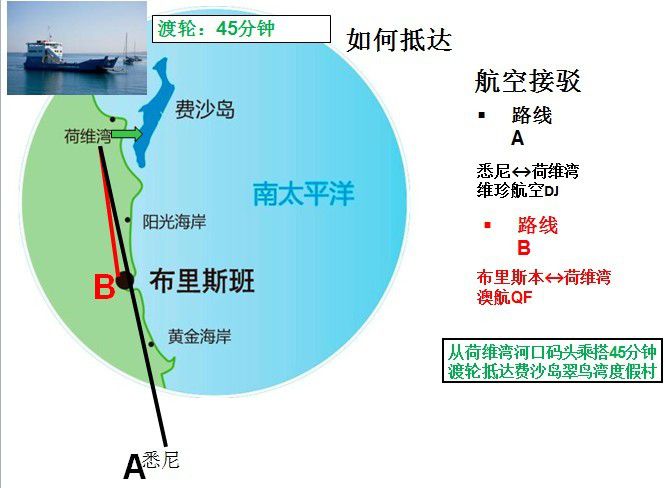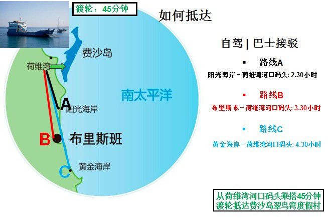 费沙岛位于澳洲昆士兰南部,离首府布里斯本约300公里,口岸城市是荷维湾(Hervey Bay)。当天早上您可以从黄金海岸,布里斯本或阳光海岸等地自驾车到费沙岛,更可乘坐度假村提供的接驳巴士。如果您身处悉尼,每天都有维珍航空的直飞航班飞抵荷维湾(Hervey Bay),到达后有度假村安排的加长版林肯车来接您到码头办理手续。澳洲航空公司每天也有多个班次从布里斯本飞到荷维湾。下面是费沙岛的地理位置: