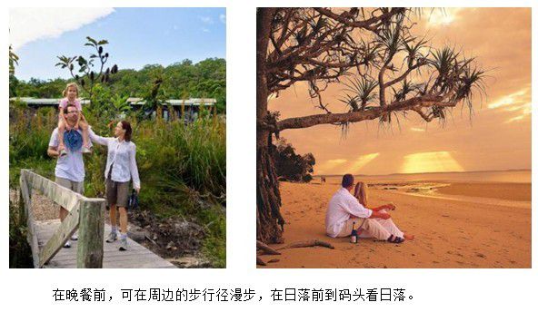 抵达度假村大堂后,将有工作人员为您进行欢迎讲解,如您需要中文的欢迎讲解,请在预订时要求Chinese meet & greet。梳洗休息后,您可漫步度假村木板栈道,感受丛林湖畔的清幽宁静,或在度假村泳池嬉水畅泳,或自费参加各种海滩活动和向导讲解之旅。傍晚可到码头小屋观赏夕阳,然后前往餐厅享用晚餐。