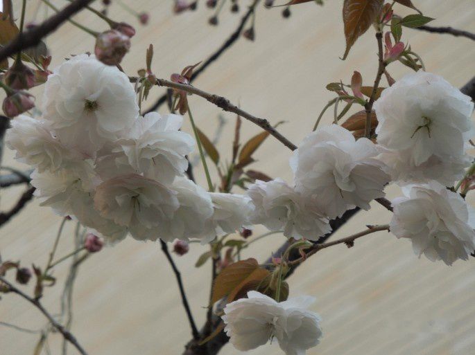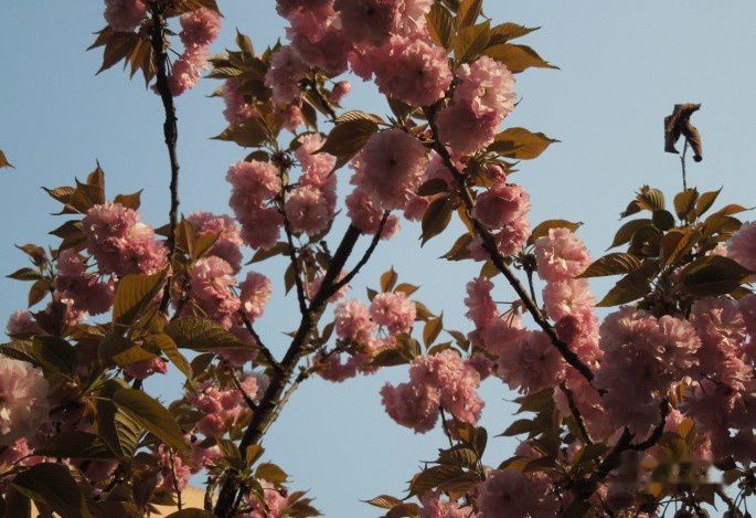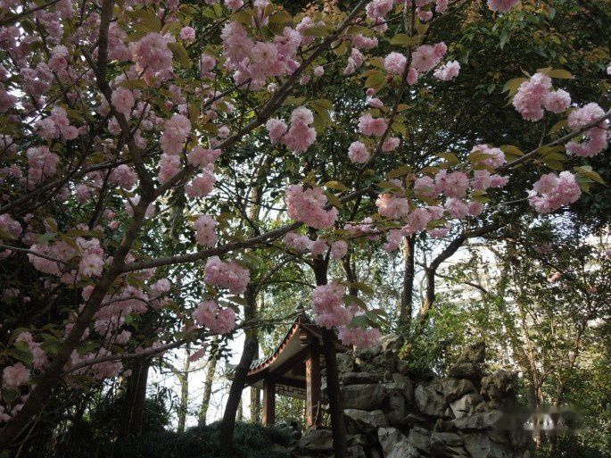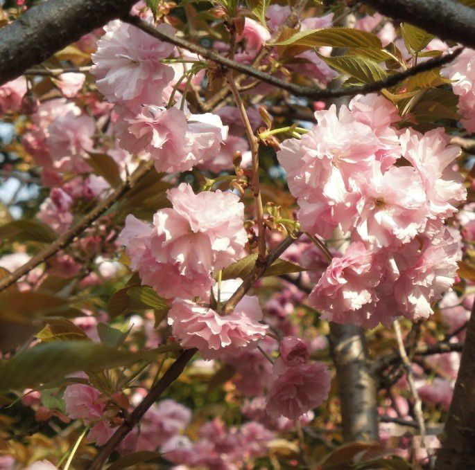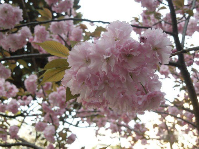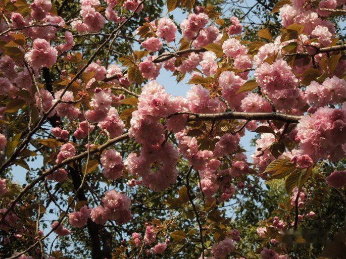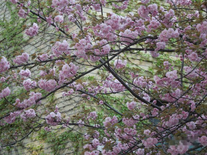 回来后上网查同济樱花的渊源,意外得知同济除了樱花大道,还有其它的樱花景观。这就解了我的疑惑,因为希望樱花大道气势再磅礴些,那天我数过樱花大道的树,离100棵差得很远,当时还想是不是成活率太低。既然100棵还没有看完,选个好天再去。几天功夫,樱花大道已是繁花落尽,旁边有一片粉色的樱花树林,品种不同,满枝花朵重重叠叠,花瓣繁复而饱满,正开得如火如荼,