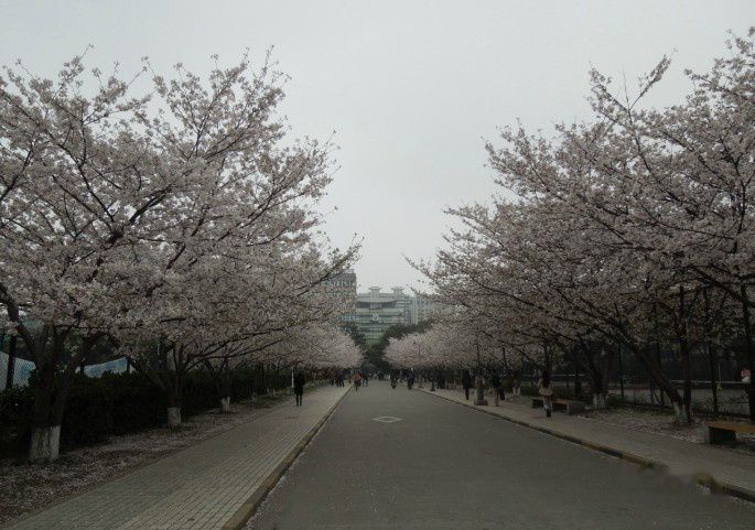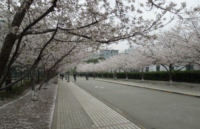 这条叫爱校路上的樱花树是上个世纪90年代中后期,日本与同济初建合作关系的一家公司为表示诚意,适逢同济大学建校90周年送的贺礼——100棵樱花树苗。