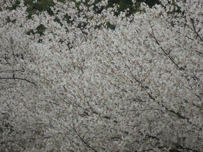 公园门口有图文并茂的介绍,告诉游客这里有多少品种的樱花树,我一点也记不住,说实话我也一点不感兴趣,我以为赏樱无所谓品种,树足够多,足够大,有姿态有规模有气势,足矣,最美还是朴素经典的白色,试想,颓势萧疏的冬天刚刚过去,在万物复苏的绿色中,突然一天见漫山遍野的白色,如梦似幻,庄严绚烂。又见一阵风来,竞相怒放的万树白花,没有一丝留恋,纷纷扬扬,如雪花飘落。花开满山,花落满山,转瞬即逝,美得纯洁,清高,凄艳,落在地上的每一朵樱花,还都展露着无悔的笑意,何等的悲壮!