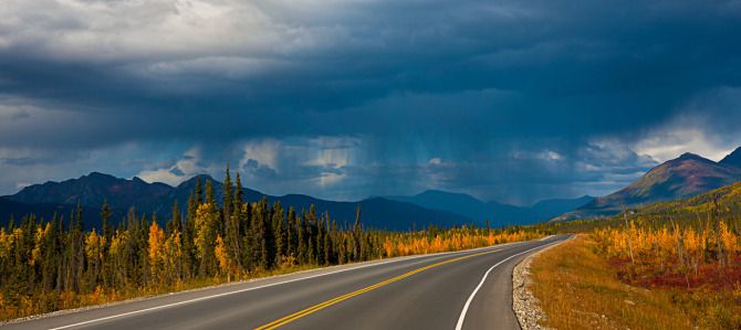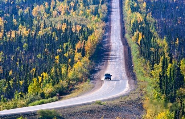8月底刚刚入秋,是阿拉斯加一年中最美的季节,一切自然的色彩浓浓郁郁地涂染着这片一望无际的荒原。出了Fairbanks不久,我们就进入了真正的荒野。沿路两边罕有人迹,除了刚刚路边那两排整齐的信箱,让我们惊奇地感受到人的存在外,其他只有道路上偶遇的油田运输车辆告诉我们仍然身处在凡世之中。而现在整个苍茫的大地上只有我们三人在互相感知着人类的呼吸。