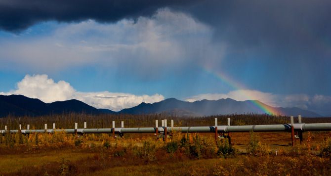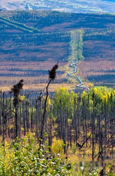 著名的阿拉斯加输油管道北起北冰洋沿岸,Dalton公路的最北端的Prudhoe Bay,南至太平洋沿岸的阿拉斯加瓦德兹(Valdez)港口,这个管道穿越了300多条河流和近650公里的冻土带,全长1480公里,年输量在4000万吨以上,是美国最大的现代化输油管道,也是阿拉斯加的一条经济大命脉,靠着石油收人,长年居住在阿拉斯加的美国公民,每年可以领到大约2万多美元的政府补助,基本不用干活。这里的石油开采量占整个美国的1/3还多。