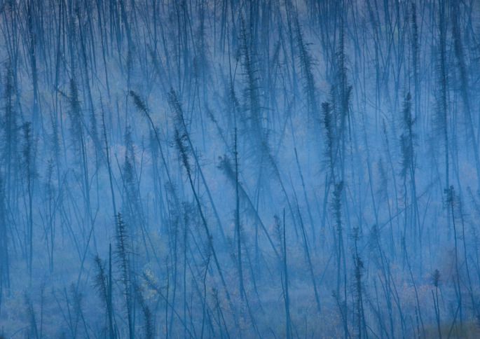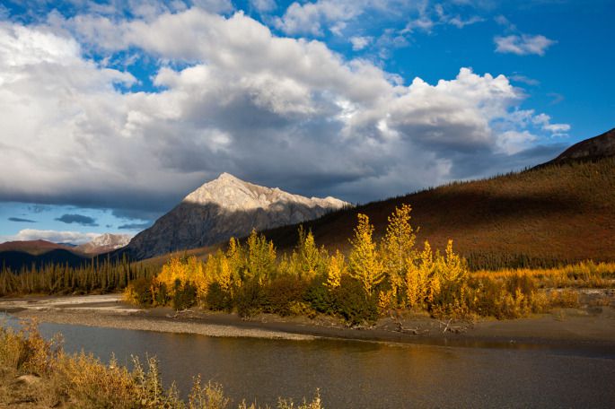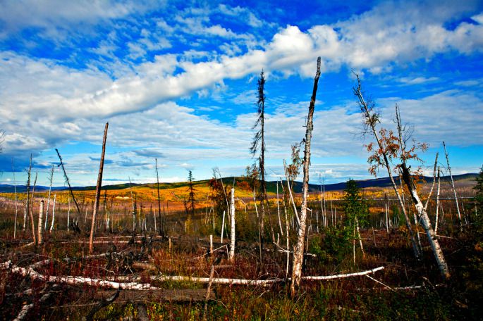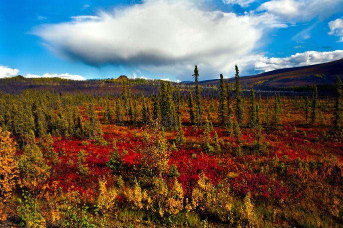 之前一路走来路上的风景都是大片大片的原始森林,郁郁葱葱,满眼绿色,是一种丰腴的壮美。而费尔班克斯向北进入北极圈的这片阿拉斯加的土地却是充满着荒凉之美。向远处望去,如果不是被山坡挡住了视线,那么你眼里无限远处一定是天地的相接。因为已进入冻原的关系,道路两边树木生长的并不高大茂密,枯枯的白色、黑色枝干松松散散地间落在开始泛黄的灌木之中,低矮的红莓透着亮紫红色铺满地面,一直延展着与天的碧蓝相融合。近天边的地方,一片片白桦树尖因了秋而开始嫩黄,于是色彩在这个时候占据了整个原野。