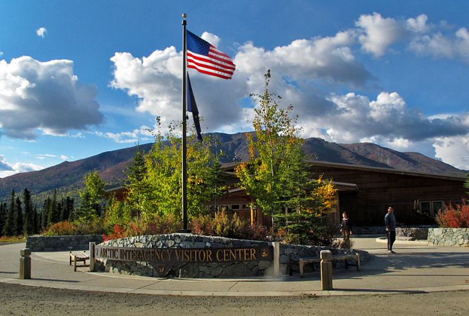 对面是北极地区旅客中心,越过这里到北冰洋660公里的碎石公路上将不再有饭店、礼品商店,没有任何服务设施,有的只是高山、森林和北极圈内无尽的冻原,还有蜿蜒的Dalton公路和输油管道象两道缎带跨越在这茫茫大地上。