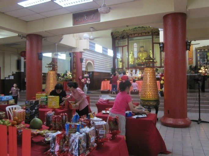 观音寺离陈家祠堂大概有30多米远,靠在一个小山丘下,旁边便是一个轻轨站台。这里华人大都信佛,这里也成了人们点香拜佛的地方。观音寺庙内有一块横扁写有"大悲殿"三个字,落款好象还是光绪什么时间。庙内很干净整洁明亮,有许多居士在忙碌着摆花什么的,24日十五,这里要开法会祈福。进入殿厅必须脱鞋,门口有专门的中英文提示,原来屋内那样清洁无尘。