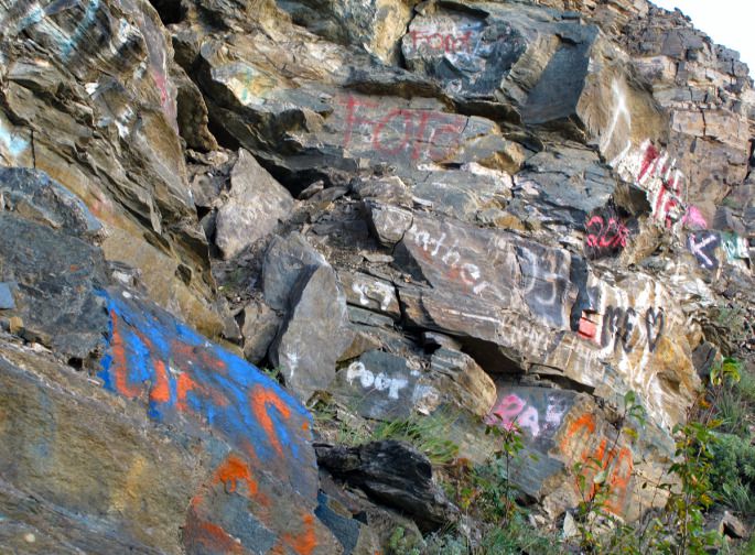 继续阿拉斯加2号公路。8点钟穿过Tanana River大铁桥,过桥右手边有一石头小山,山石上刻画着很多人的名字,这些都是来阿拉斯加的游客留下的,希望将自己一部分灵魂永远放逐在这片纯净的土地上。我们当然也不例外,踩着碎石手脚并用地爬上半山腰,用刀片刻下3个人的名字,和一句永久的祝愿“好人一生平安”!