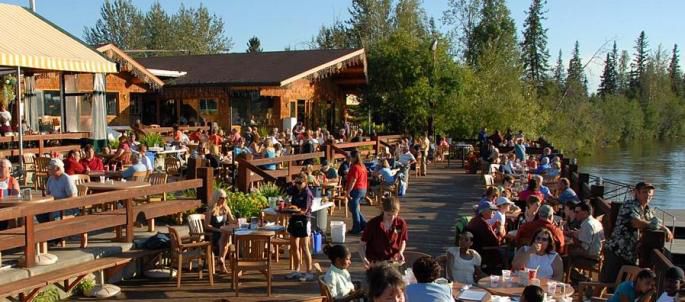 根据旅馆前台提供的地址,我们找到了Pike‘s Landing River Front Dining这家据说是费尔班克斯最为有名的餐厅,以拥有阿拉斯加最大最美的露台而著名。服务员引领我们来到露台上,这里的环境真是很美。露台紧临切纳河岸,坐在这里,切纳河的美景尽收眼底。河水很深,有游轮穿行,河面上点缀着许多色彩鲜艳的皮划艇、帆船。河对面是大片绿色的树林,靠近岸边有一个高尔夫球场,有趣的是,球是从河这岸打过去的。露台下方有一块场地,客人交了钱就可以去打几竿,技术不好球是打不过岸的,很多球落入河水中。坐在露台的阳伞下,欣赏着眼前的美景,一扫几天来的风尘仆仆。