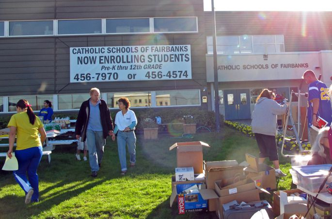 今天是星期天,Catholic Schools of Fairbanks费尔班克斯天主教学校门前摆起了一个很大规模的Yard Sale(庭院售物也叫车库售物),应该是学校组织的一次义卖活动。Yard Sale算是美国一个传统的文化现象,每到周末,很多人家到政府申请许就可在自己家的院门口或车库里售卖自家用不到的东西,价格都非常便宜。很多美国人把逛Yard Sale做为周末的消遣,运气好的时候,真能用很少的钱淘到昂贵的古董。