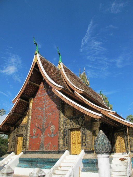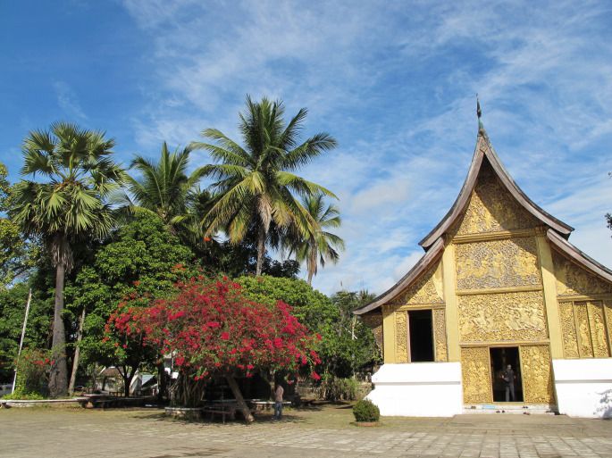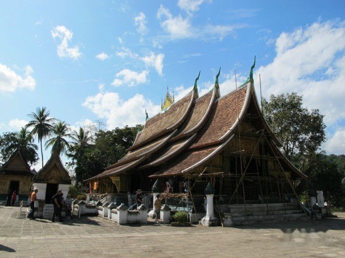 迈佛寺,主殿四层檐的建筑是典型的琅勃拉邦庙宇风格。