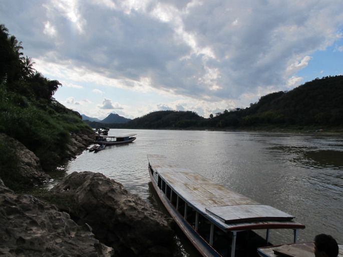 从香通寺另一侧门出去,下了几十级台阶,就到了湄公河边,岸边停着好多游船,正商量间,一位本地的大叔过来问我们要不要船游湄公河,两个人包条船10万基普,算一算不到人民币80元,我们立刻将说好的穷游抛到了脑后。