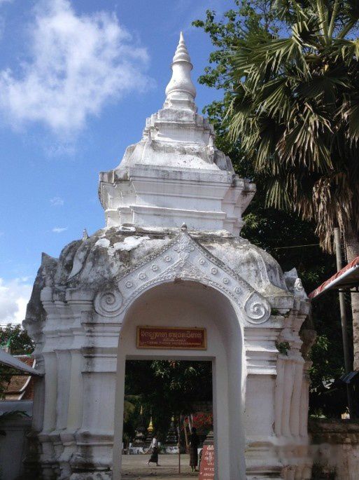 出了王宫,漫无目的地前行,忽见路边一座小小的白塔在日光下白得耀眼,近看才发现竟是香通寺 - 这座琅勃拉邦最美丽、最宏伟、最著名的一座庙宇 - 的大门。