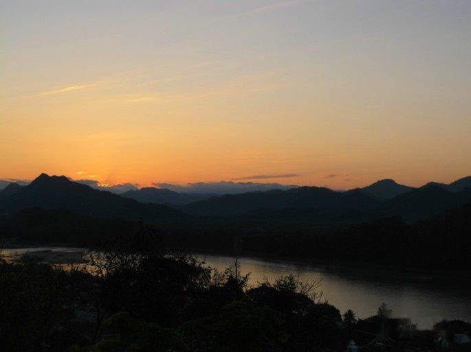 看看时间正好,我们决定溜达着去普西山看看日落,半路碰到几个热情的成都老乡多聊了几句,结果上山的时候竟被一个下山的欧美帅哥奚落说I think you are late. 管他呢,都爬了一半了,晚了咱也要上山。三步并作两步登上山顶,刚好看到落下的夕阳给云彩勾勒了金边,漫天红霞映照着远处的湄公河和山脚下的琅勃拉邦城,简直美不胜收。