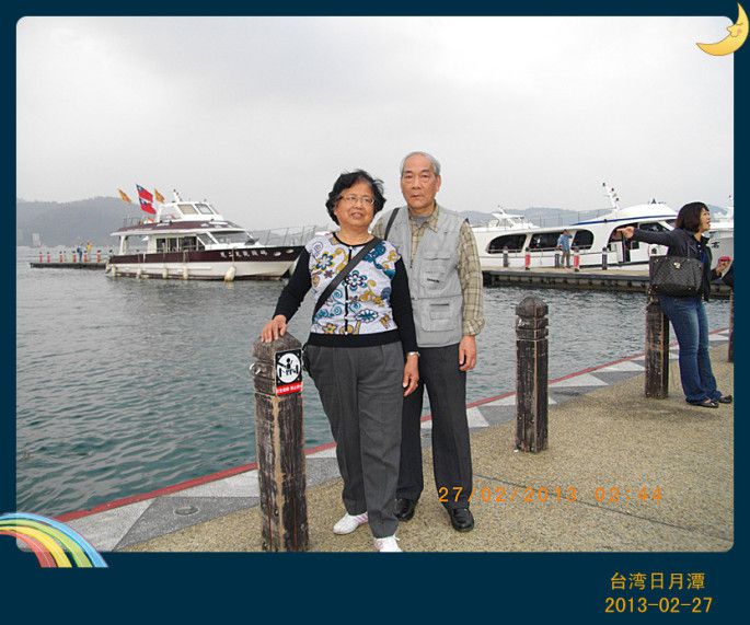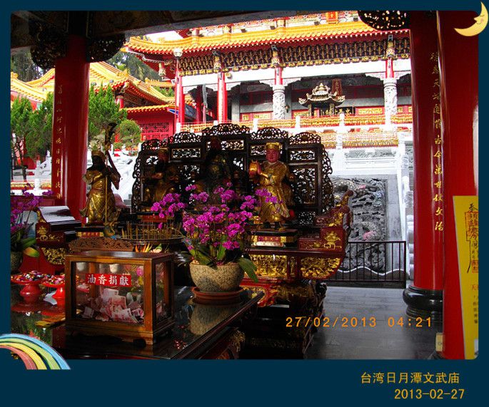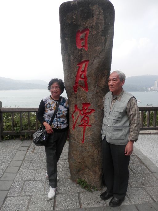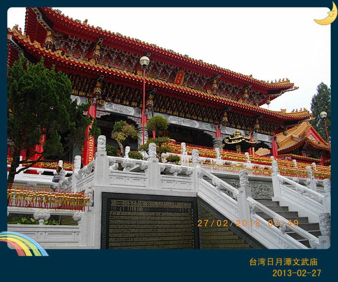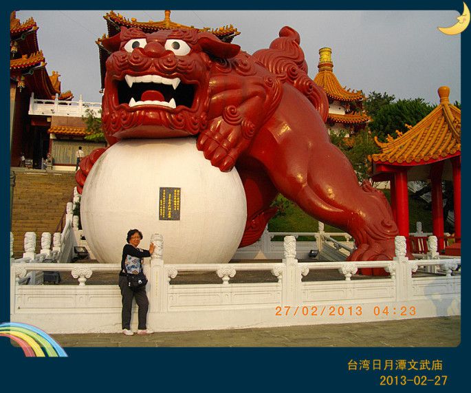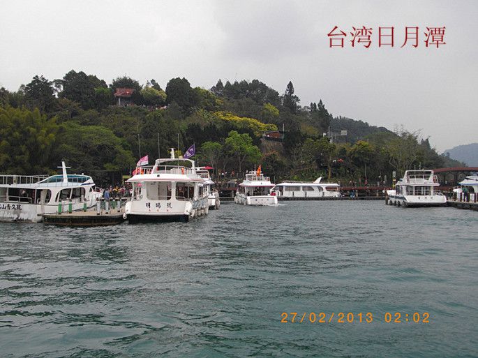 离开南投中台禅寺经过大约半个小时的行程,饱览了一路公路两侧高大挺拔的槟榔林和时时出没的沙砾溪滩,我们来到了宝岛另一个著名的风景区—日月潭。停车场附近那棵粗大横卧的古树边就是游船码头。日月潭位于南投县渔池乡,四周群山环抱,山清水秀,是台湾唯一的天然淡水湖泊。由玉山和阿里山之间的断裂盆地积水而成。海拔748米,面积7.93平方公里,最大水深27米,全湖周长35公里。日月潭湖中有一拉鲁岛(原名光华岛),以此岛为界,北湖形如圆日,南湖状如弯月,日月潭因此而得名。我们团队36人登船游湖,疾驰于清澈见底,碧绿生清的湖水中,遥望四周连绵不断的群山,看着船沿两侧不断翻滚的白浪,湖风扑面,真是心旷神怡,有一种说不出的惬意感觉。游船驶抵日月潭当中的玄光寺,我们下船拾级登山,山上建有一座小寺庙,一座只有几十平方米的小寺庙,孤零零地居中坐着那个千辛万苦披荆斩棘到西天取经最后凯旋而归的唐玄奘。据说,那是因为抗战时期唐僧的几颗舍利子落到了小日本手里,是国民政府通过交涉把舍利子要了回来并且供奉在美丽的日月潭畔。也算是为中华民族做了一件好事。玄光寺前那块竖着的“日月潭”石碑成了来自五湖四海的游客排队摄影的好地方。从玄光寺回来后,我们又驱车去拜谒了雄踞于日月潭北面山麓的“文武庙”。文武庙始建于1934年,历经4年,于1938年建成。当时基地面积只有0.543公顷,建筑物面积80平方米。奉祀孔子,文昌帝君和关圣帝君及从祀诸神。香火鼎盛。到上世纪50年代,因寺庙已旧,乃进行了重建扩建,基地面积扩大到1.0224公顷,建筑面积1061平方米。1976年正式落成。总工程费用2150万台币。所用木材之珍贵,雕刻技术之精美,实为世间少有。令人痛心的是1999年发生了南投县渔池地区“9.21”7.8级大地震,文武庙几近被毁,到2003年才重建完成。文武庙地势陡峭,倚山而建,座东朝西背山面湖,正门面临环湖公路,殿宇辉煌,格调恢弘是一座前中后三殿式的仿古建筑。文殿奉祀至圣先师孔子,武殿奉祀关圣帝君关公和岳武穆王岳飞。金黄色的殿宇确实是气势非凡,特别是走进高大的山门石牌楼后,格外引人为之一惊的是那大殿前广场上那一对巨大的酱红色石狮子,大到人与狮子比例严重失调,实为罕见!日月潭景区除了游湖,玄光寺,文武庙外还有慈恩塔,孔雀园,涵碧楼等,有意者当可作自由行深度游,那是后话。不过日月潭值得一游那是真话,特别是那湖水清澈见底,据说能见度可达10米,而且湖区水质环保不知要比大陆的无锡太湖好多少倍。不谈了。当晚我们就下榻于南投埔里镇镇宝大饭店。