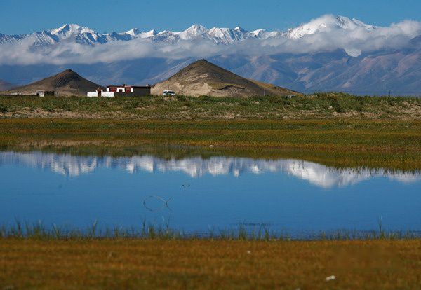 ↑蓝天、雪山,和像哈达一样围绕着雪山的云雾;小山包、藏式房屋和小水潭,这一切都是大自然这只神奇之手造就的。