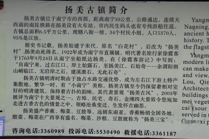 扬美古镇牌楼。扬美古镇始建于宋代,至今已有上千年的历史。自建镇到民国年间,一直是近百公里范围的商品集散地,繁荣一时,素有“小南宁”之称。扬美是南宁市明清古建筑保留得最为完整的地方,保留下来的文化遗产遍布全镇,现有二百多处,大多分布在古镇内的各街巷里,特色鲜明的明清民居有的还完好无损,因此今天又得名“扬美古镇”。