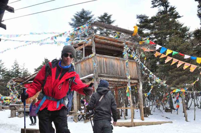 天气依然十分晴好,数着电线杆的号码一路向上,(总共多少根我忘了),那个山路啊,基本没有路啊,走的时候我才明白,网上说的那个雨崩就是汗如雨下令人崩溃的意思,果然是真真的啊!这是徒步的一天,面对赤手空拳的我,队友们纷纷慷慨相助,嘣哥借我一副手套,上海姑娘借我战袍,于是,姑娘我精力充沛武装齐全,十分勇猛一路向上,呈黑马之势一举夺冠,在经幡遍布的垭口,我和上火哥第一个到达。在海拔3800米的垭口,看着远方的神女峰与五冠仁峰无比清晰地矗立在正前方,美得令人眩晕,姑娘我就爬上观景台去风中凌乱了一把。等大队人马都到齐后,嘣哥宣布:这一回由江西代表队获胜!无比兴奋啊!
