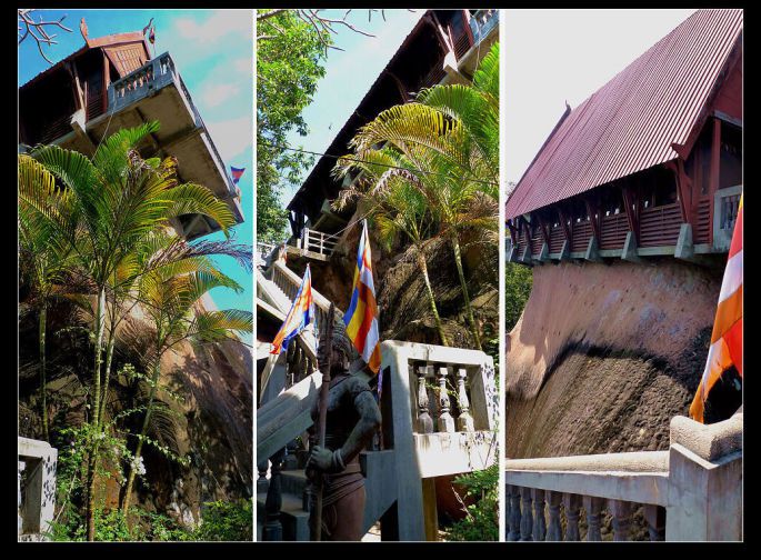 整个建筑结构坐落在一块 20 多米高、10 米宽的巨石上。我们必须脱掉鞋子,沿水泥楼梯拾级而上,朝拜过菩萨后从另一条路返回穿鞋(听说有人的鞋子就丢了,建议好鞋子自己随身携带吧)。