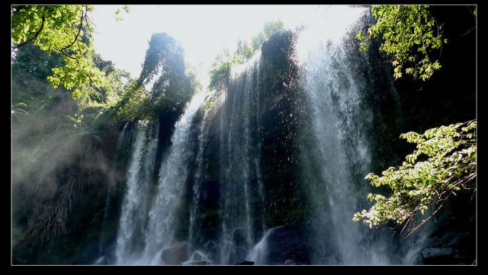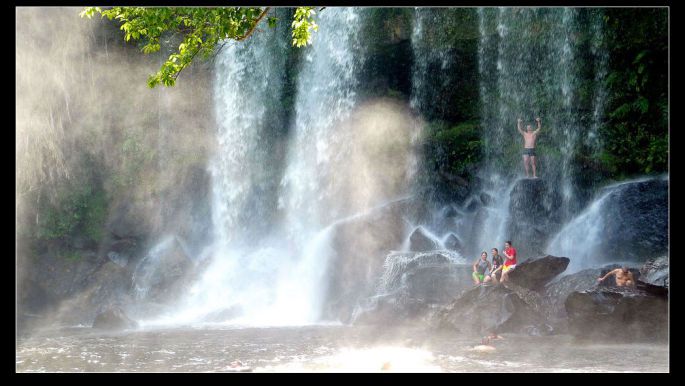 午饭后漫不经心的前往波利昂通瀑布。到了这里才知别有洞天啊!瀑布在暹粒河上游一个开阔的山谷,四周茂林修竹夹峙。瀑布分上下两级,第一级不高,顺着石壁倾注在一块宽大的平台上,形成一个浅浅的水潭。