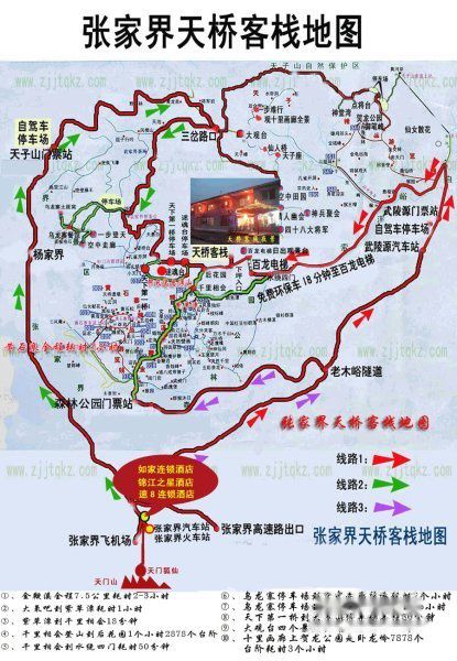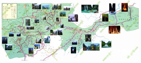 早上8点半的火车到达张家界火车站。然后从火车站出来往广场左手边走,直接去找汽车站。一路上不要搭理那些拉客的,道理大家都懂得,最好也别急着在火车站照相啥的,那样的话别人一看你就是来旅游的,马上就会围很多人过来给你介绍啥的,你也照不安逸,如果要在火车站照标志性的东西,就等你玩完了要归程的时候,再去照吧。反正你也已经玩过了,也不怕别人骚扰了,自己底气都足些。到了汽车站,你可以去售票窗口问问到森林公园的车,也可以直接去过安检,跟着标志找到森林公园的乘车区间。因为你到了售票窗口,也只能问问在哪坐车,也不能买票,因为他们短途的是上车买票的。当然,到武陵源,天子山等等,都是一样的。我是选择到森林公园的,票价十元一个人。大概四十多分钟就能到了。然后下去去景区大门口买票。张家界国家森林公园门票价格:245加3元保险。我买的是学生票,24周岁以前的全日制在校学生,研究生,都可以享受优惠价163加保险3元。这个门票是包含了景区里面的环保车的。但是不包含里面的小火车啊缆车啊,电梯啊啥的,但是事实证明这些都是可以不用坐的。下面附上一张景区地图。