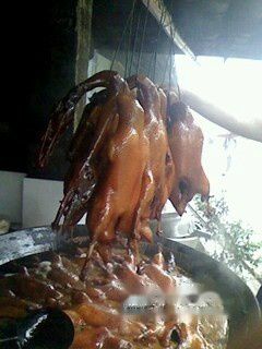 我还是最喜欢一家小店的招牌特色——朱鸭子。鸭子鸭子,但这家鸭子有何不同呢?这家鸭子是先把鸭子给蒸熟了,然后用密制的卤汁来煮,来卤,最后把鸭子炸一下,美味的,脆脆的,鸭子就做成啦!啧,那个色香味俱全啊