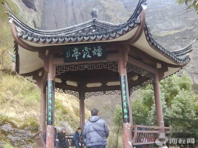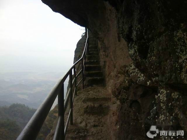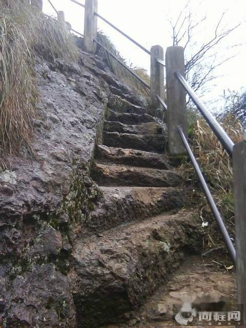 即使这样小心着,因为山岩有水渗出,路上变得湿滑,还是不小心滑了下去,我双手死死拉住栏杆,人后仰,一只脚已经滑出栏杆,被吓出一身冷汗,动弹不得,在下面领路的同学见状,赶紧过来拉我起来,足足几分钟,脸色煞白,说不出话,只是瞪着山道。半响缓过神来,擦了擦汗,喝了点水之后,夹在他们中间继续下山,只是速度有点放慢,如果碰见难走的地方,前面的会提醒我注意脚下,自己感觉小腿肚这里隐隐酸痛不已,咬咬牙继续下行,走着走着当路过静心石室看见秀丽风景的时候又忘记刚才的历险,跟他们一路谈笑、帮他们合影,自己也顺便拍照留个念。一直到烟霞亭这里,才放心让我休息,他们继续下山。