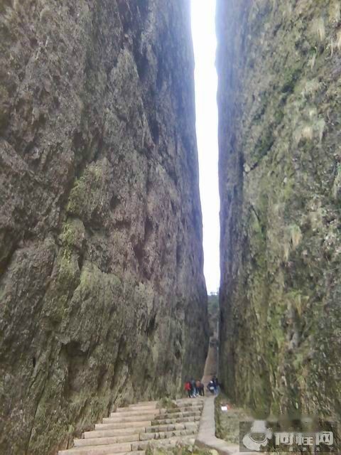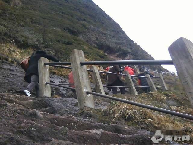 抬头可见,两面大山压顶而下,中间极窄的通道穿山而过,走进之后才见其实过道甚宽,只是风有些大,夹着细小的雪花飘然而过。赶紧上去到了登天坪稍作休息,听旁边导游在对一家子人说,上山开始难走,如果老人不能爬,可以从坎坷岭下山,结果他们一家老小,都决定上山,我也跟他们一路同行。