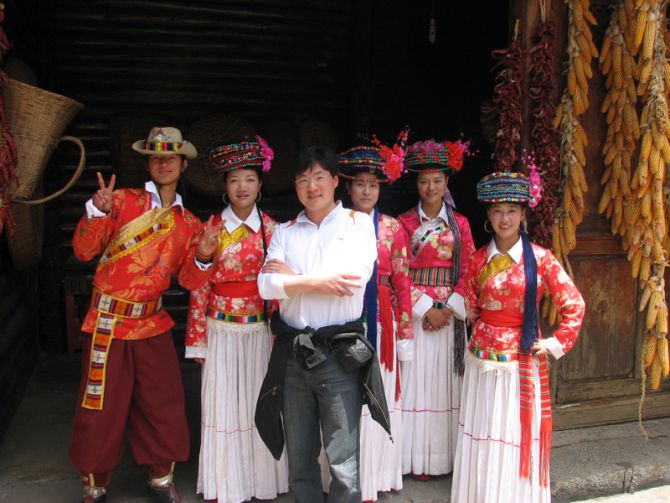 男子服装最漂亮的当属摩梭族,那么多颜色和式样在他们身上和谐地搭配在一起,如果我是摩梭族男人,我一定不会为我的衣服发愁,而不会像现在走进商场看到的不是西装就是夹克,不是T恤就是衬衫,一点创意都没有。摩梭族村里的小伙都是又高又帅,其中有个长得很像何润东,不过女孩就一般了,我肯定不会和她们走婚,而是走为上计。有个摩梭族的女孩很热情地递给我一碗酥油茶,我喝了一口,香甜可口,有点像奶茶的味道。其实现在民族村里很多少数民族还是保持着热情好客、淳朴善良的本性,他们对游客都很友善,会给你免费品尝各种小吃,如果偶尔碰到个找你要钱的,那肯定是汉人装的。