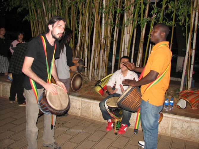 听,一阵极富节奏的鼓点传来,难道是安魂曲吗?循声觅去,原来是翠湖边几位乐手在尽情演奏,有中国人,有白人,还有黑人,演奏的都是云南特有的少数民族乐器,双手气促地敲击着乐器,身体扭动成了音符,密集的鼓点让你的耳膜成了鼓面,强烈的节奏让你的神经成了琴弦,演奏的乐手乐在其中,旁边的路人醉在其中,各得其乐,其乐融融。都说音乐不分国界,在这里得到了最好的体现。