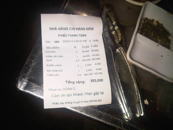 看看账单,不算白酒只算啤酒,共计55万VND,约165元。