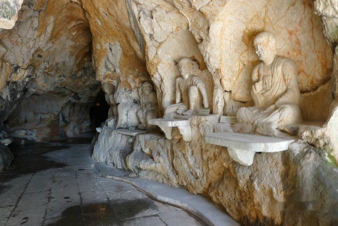 烟霞洞就在马路边,游人也极少,我依然是怯怯地走进洞,两边雕凿着观音和形态各异的罗汉等像,栩栩如生,我举起相机拍了两张,不敢再往里走了。