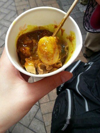香港怎么能不吃咖喱鱼丸类,满大街到处都可以找到的小吃。咖喱很香,可以选择小辣,或者大辣,蒜香浓郁,鱼丸很Q弹,果然不同于超市那种感觉是全淀粉做的粉鱼丸一样没有嚼头,还买了一串螺肉,螺肉口感厚实,一点也不塞牙,煮的嫩的刚刚好。价格嘛,两串也就是20港币的样子。