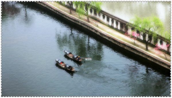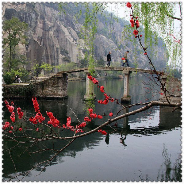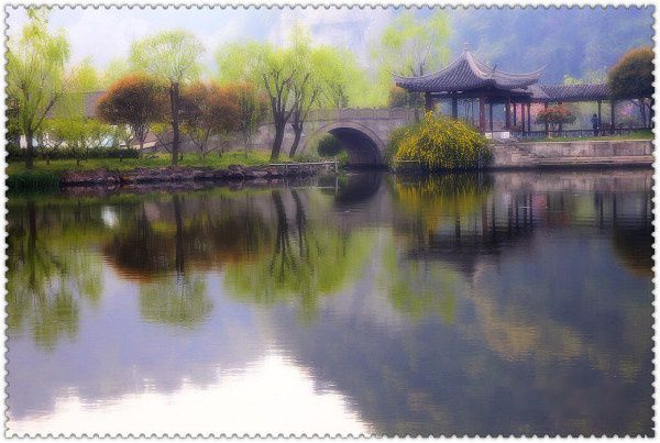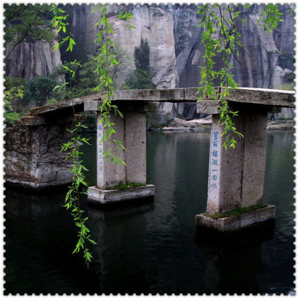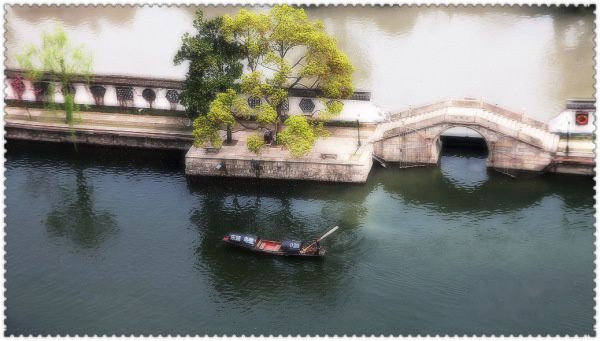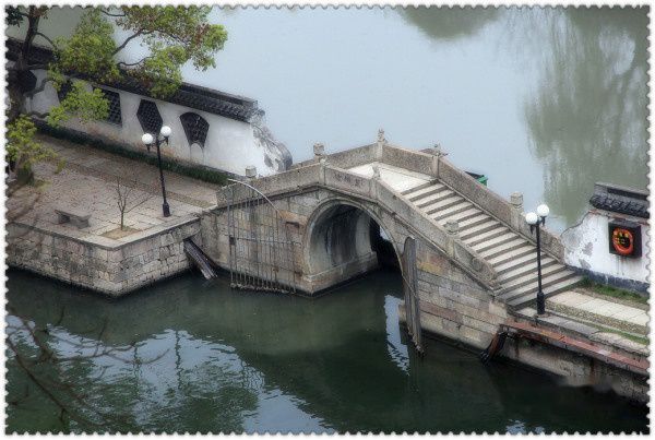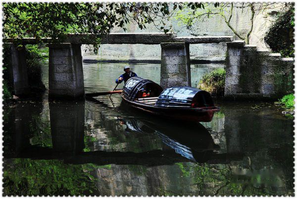 东湖窄长,九座石桥横跨湖面。秦桥左右三孔梁桥,中间一马蹄拱门。据说,始皇东巡,马踏此桥。三孔板桥,三块石板左右扭转,非亲自步行不得其妙。放眼东湖,水如飘碧,湖平似镜;桥影成双,真假难辩;乌篷来去,波纹摇曳,犹如一幅轻舟烟雨图。