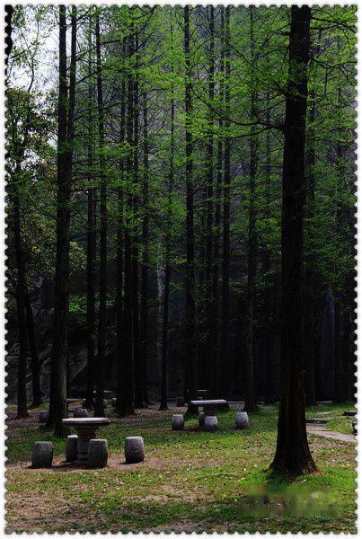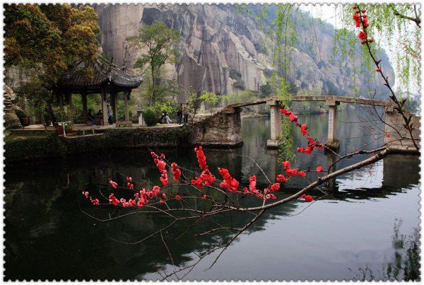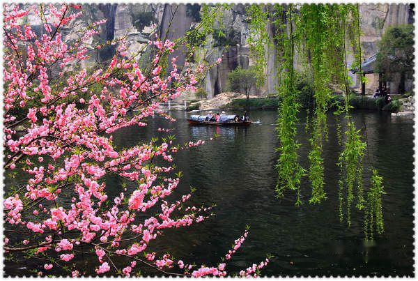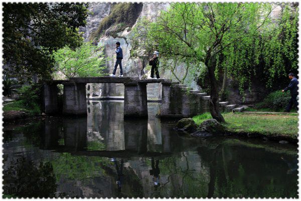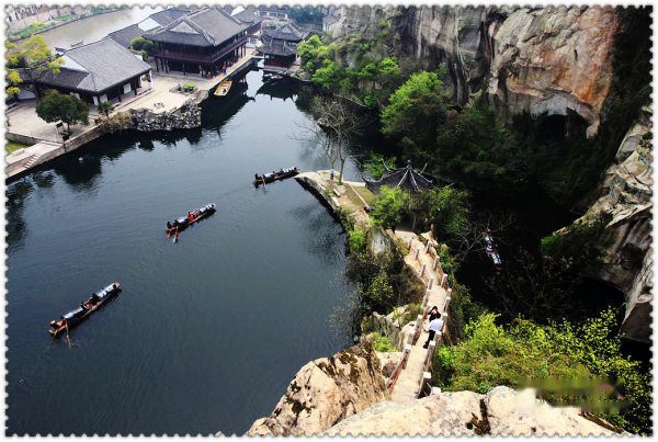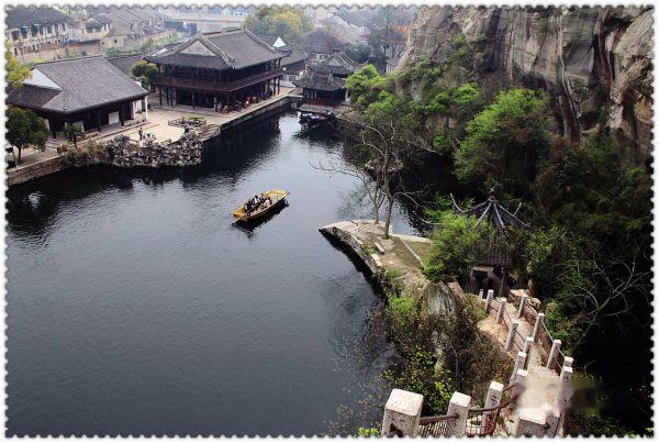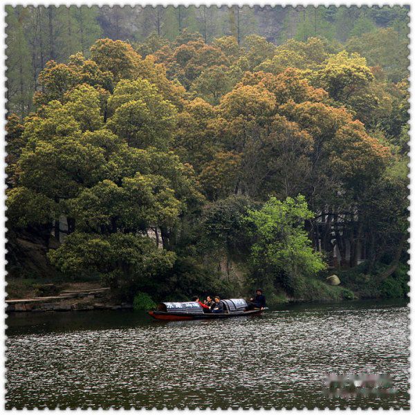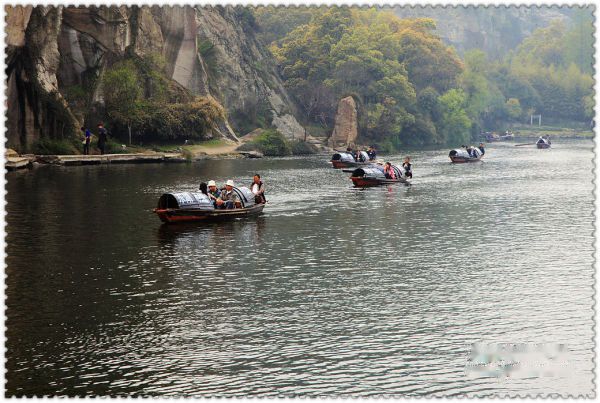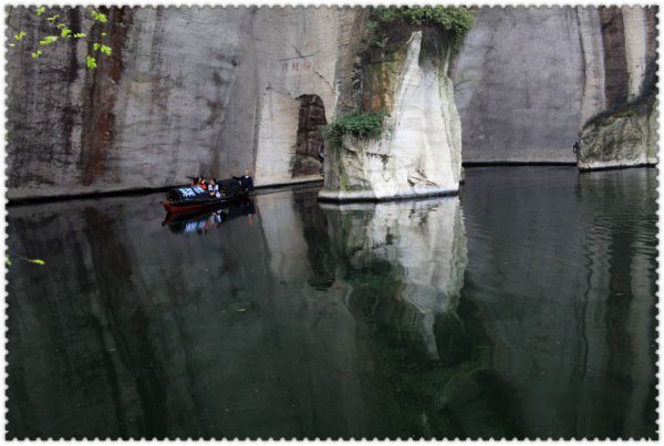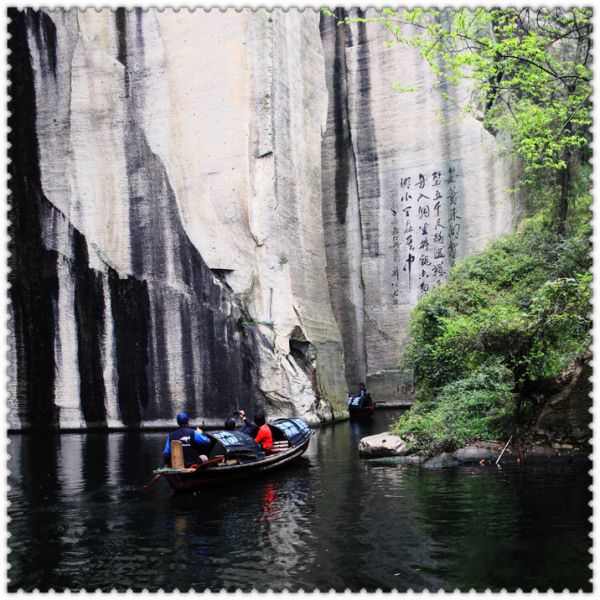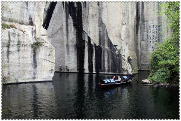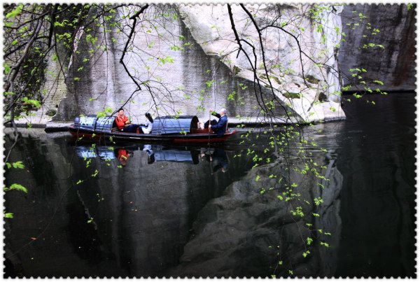 正如郭老所言,陶公洞进口极窄,仅容一船,里面一线天光**,别有洞天。小船划进洞内,周围石壁高可十余丈,伸手摩挲岩石,岩石没有断层,也没有裂纹,从上到下,平滑如缎。仰望,巨崖摩天,仿佛从天上垂下,压顶而来,气势逼人。洞内潭水黛绿,深不见底,手入水中,特别清凉。仰头而望洞顶,如井底观天。峭壁上岩泉涔涔,水珠凌空飞落水面,发出清脆的“吧嗒”声;船桨击水,如同瓮中击掌,声音奇妙。据说,文人墨客最喜爱立于陶公洞侧的听湫亭,听洞内水珠掉落水潭的声音,每当夜阑人静,泉滴声声敲击心弦,这时何等的安宁与空灵。