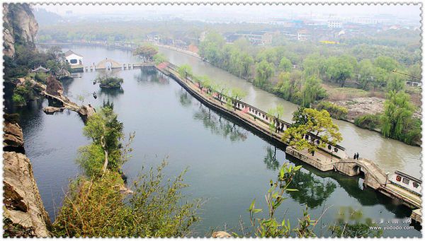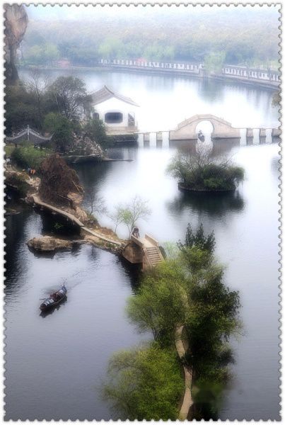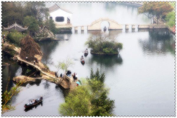 弃舟登崖,拾级而上,直达山顶。茶甸青翠,竹林影斜;黄狗酣睡,鸡雏觅食。临崖眺望,远山近水,奔来眼底。远望东北,河道纵横,道路阡陌,村庄星罗;西望蠡城,楼宇林立,街道如织,人车无形;远望南山,山峦连绵,近翠远黛,不知其终。俯瞰东湖,水色深黛,河堤蜿蜒,湖柳拍岸;水榭亭台,湖水回环,石桥9座,横卧其间,一汪碧水,一分为三;白墙黛瓦,长堤如带,墙外运河,船行水黄;墙内湖水,水墨数汪,乌篷悠悠,游人点点;白玉长堤,树绿花红,亭台楼阁,错落其中……
