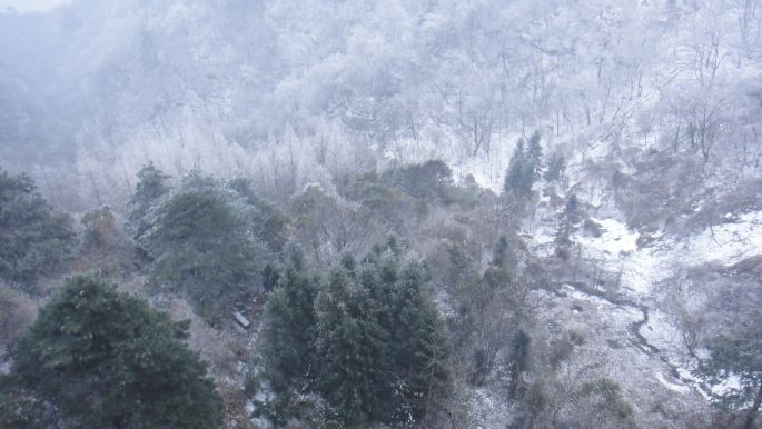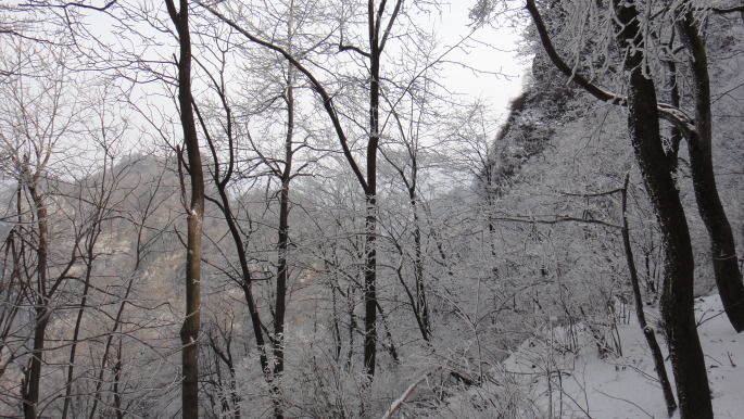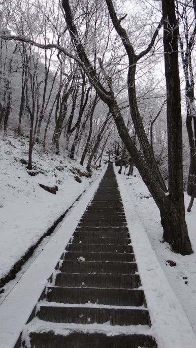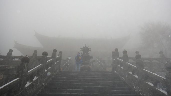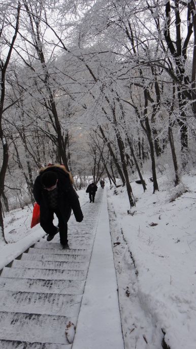 站在去太子坡的路口等,还好车比较多,一会就等到了去南岩的车。从等车的路口到太子坡还有2km的距离。车子在大雾中穿行,半山腰已经在下雪了,车开的很慢。又过了40分钟的样子,终于到了乌鸦岭。下车沿着路往山上走。因为雾大得已经看不见5m外了,所以一点点的,慢慢地去找酒店。好在酒店很近。