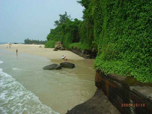 我走在沙滩上,到处是海馈赠的礼物,贝壳、海螺、螃蟹、海藻、玳瑁,还有鲎硬硬的壳。沙滩上有个戴斗笠的姑娘,一手拿铲,一手拿桶,在沙滩上很用心的挖着,原来是在挖藏在沙子里的贝壳,看似空旷的沙滩上原来藏着这么多宝贝。我顺着山崖