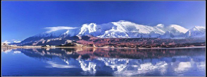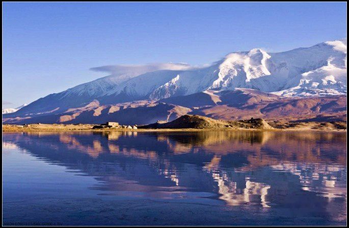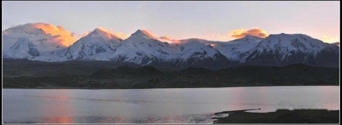 阳光终于升起,她的光芒将卡湖照亮,这是温柔的光,斜斜地射在雪山,卡湖上。阳光下圣洁的慕士塔格峰发出光芒,好像一位威武的将军屹立在天地之间。微风吹起它那洁白的战袍,不屈的形象倒映在卡拉库里湖静逸的湖水之中,对面绵延的公格尔峰仿佛是等待受阅的的士兵。