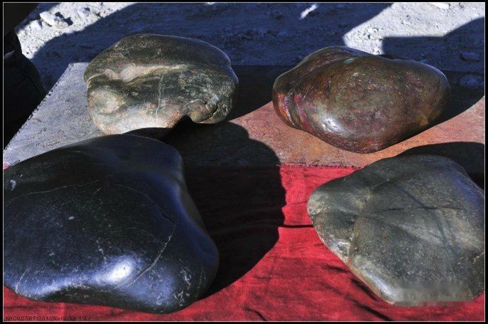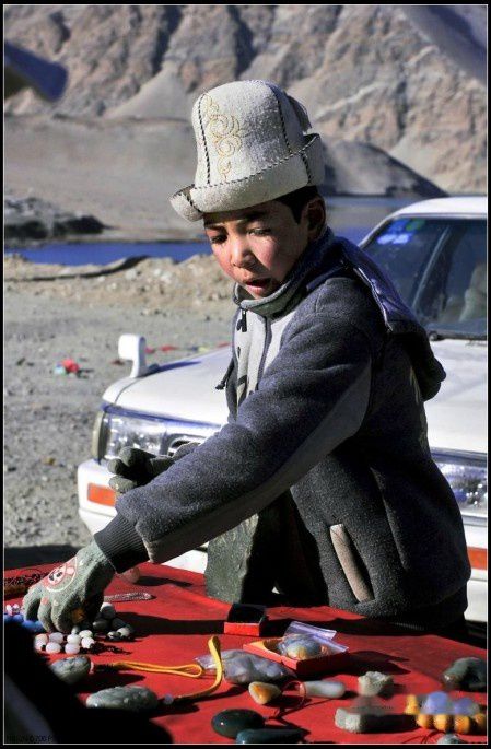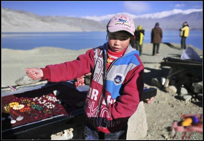 白沙湖的水蓝得令人心醉。不过此景点原生态即将消失,布伦口-公格尔水电站开发建设,这里在不久的将来会变为一个水库。湖边有不少卖石头的小摊,很多孩子是经营者。