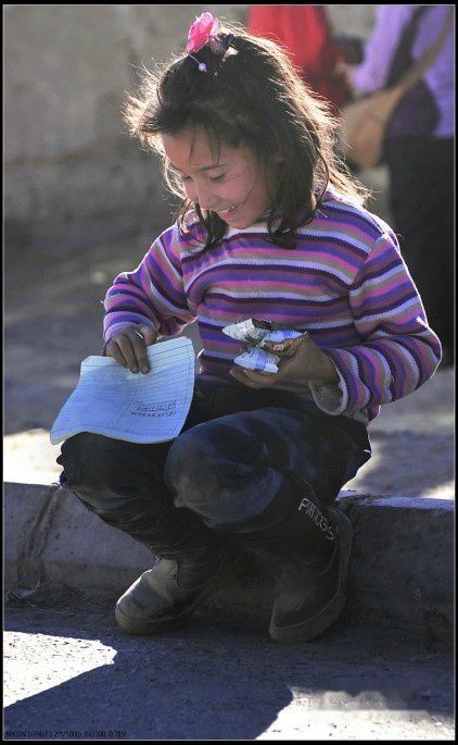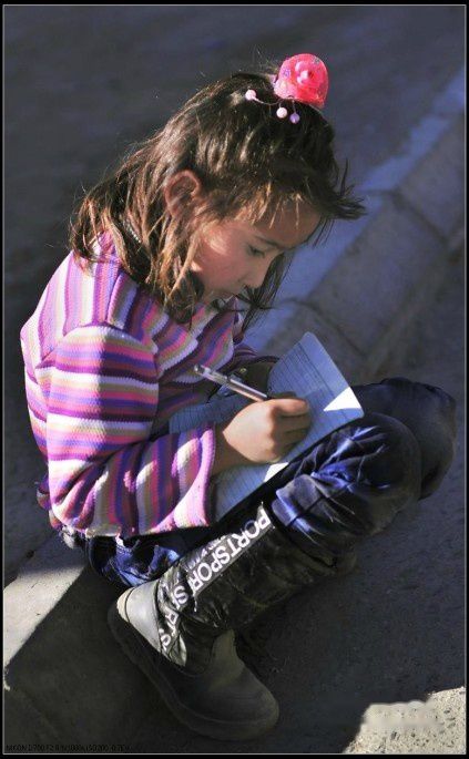 下山后,在石头城前遇见一个坐在路边做功课的小女孩,柔软的光线打在女孩的头发上,有一层光晕。