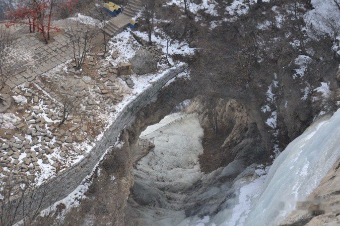 位于天生桥下方的一瀑,通过桥下的孔洞亦可看见其后二瀑的冰挂。