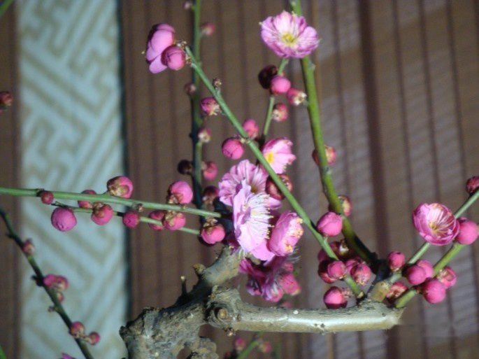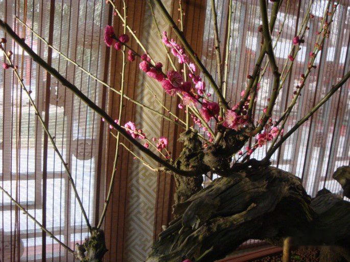 对于花展来说,五开间的涵远堂还是略显小了些,加之主办方还把原本很大很光亮的玻璃窗用竹帘遮上,搞得室内阴暗无光,不知是怕光照太多影响花期,还是有意要创造这么个幽暗的环境,让人们边赏梅边感悟点什么?!可拍摄出的梅花暗淡无光肯定不好看!